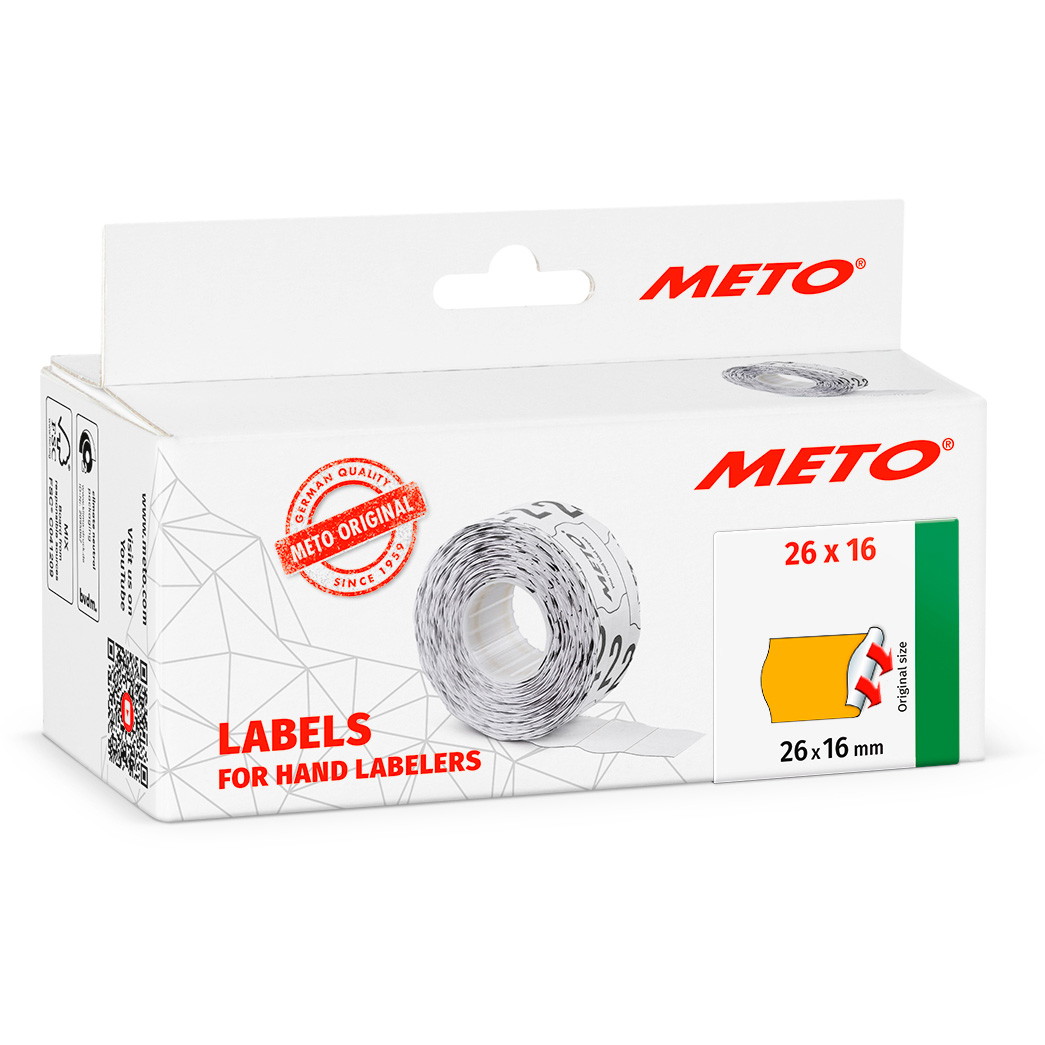 Meto permanente prisetiketter i neonorange med størrelsen 16 x 26 mm. Egnet til alle almindelige 2-linjes håndholdte prismærkepistoler med etiketstørrelse 26 x 16 mm. 6 ruller med 1000 stk. pr. rulle.