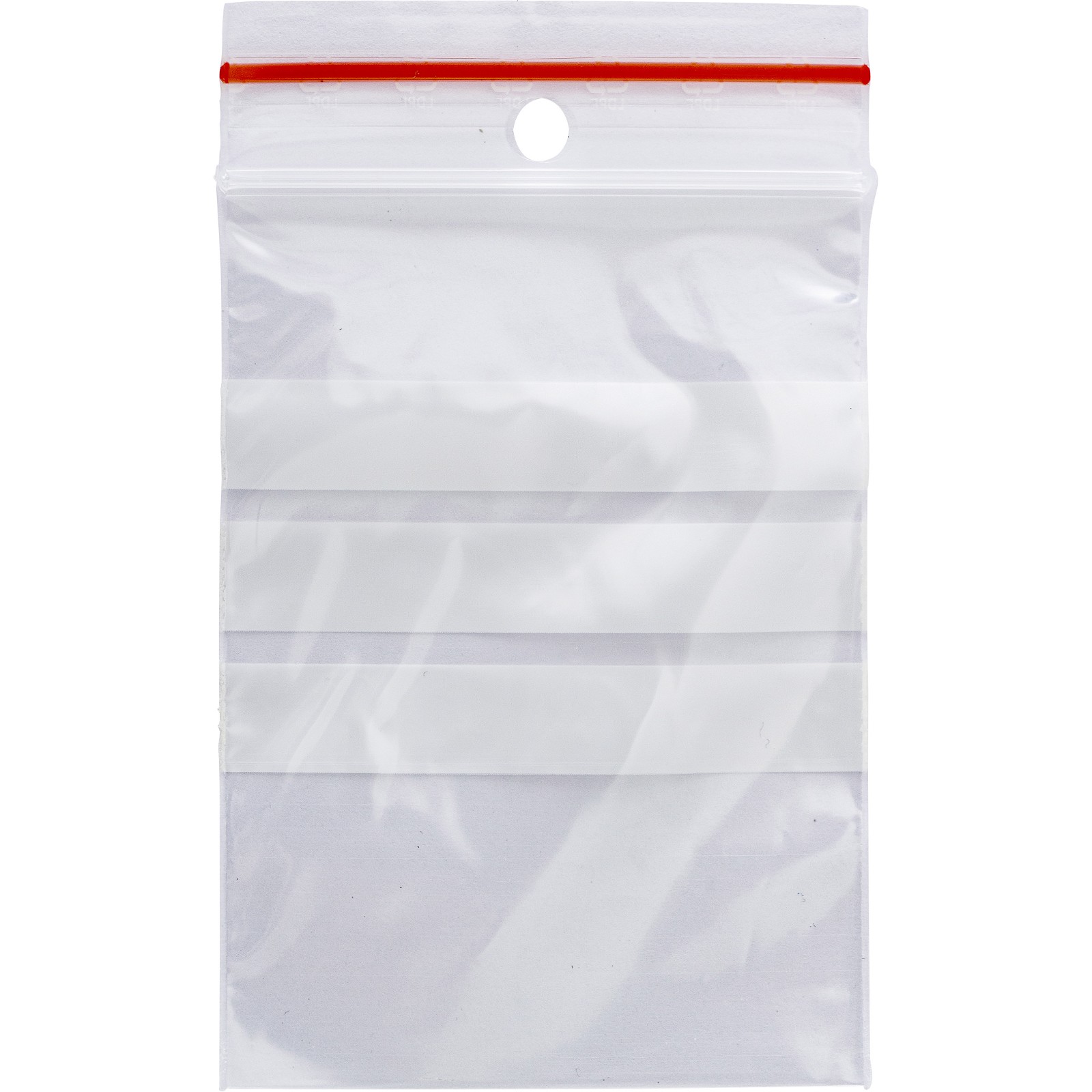 Let genlukkelige lynlåsposer med gennemsigtig struktur, hvide skrivelinjer og en rød linje lige over forseglingen. Poserne er super anvendelige og gode til at holde styr på mindre genstande, så de ikke forsvinder.