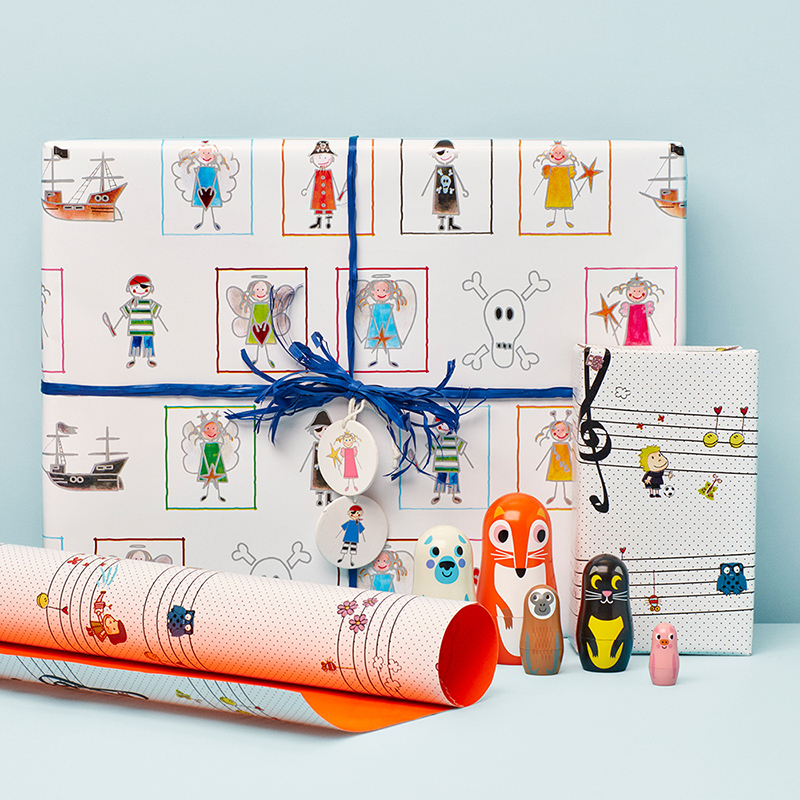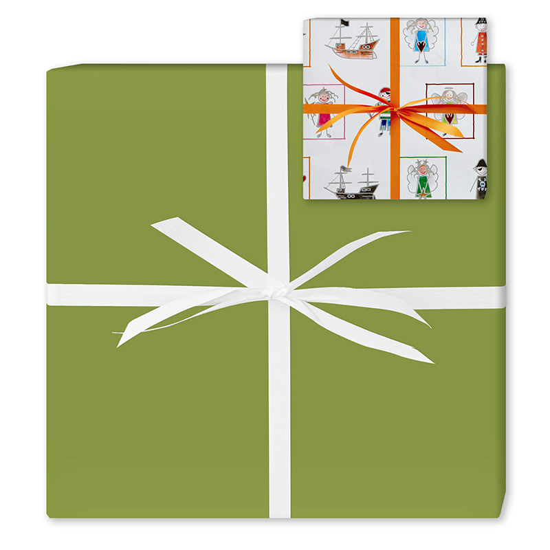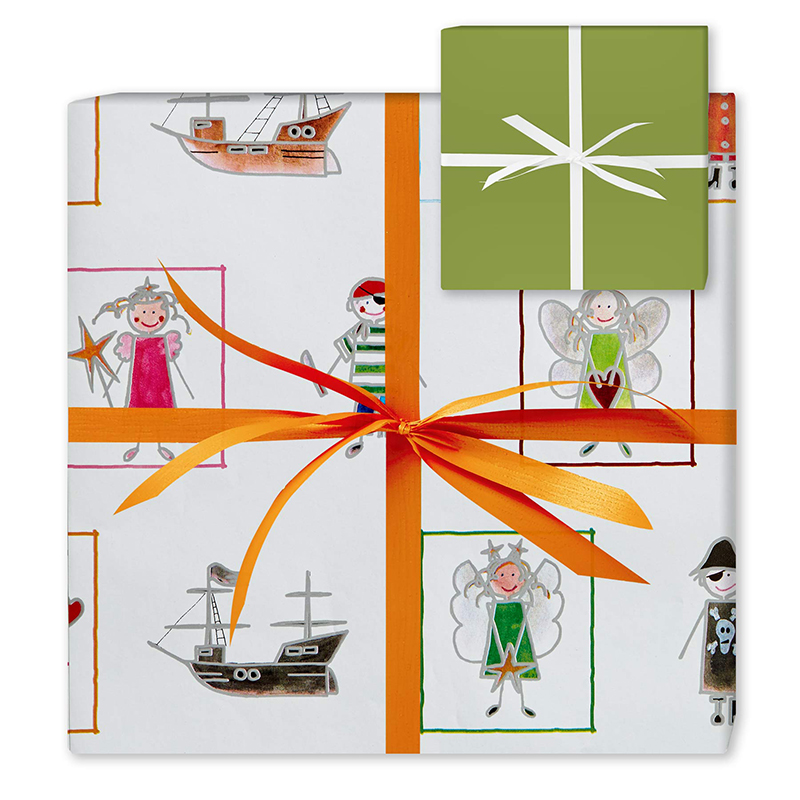 2-sidet eventyrligt børnegavepapir, der på den ene side har tryk af prinsesser og pirater, der appellerer til begge køn. Den anden side er helt grøn.