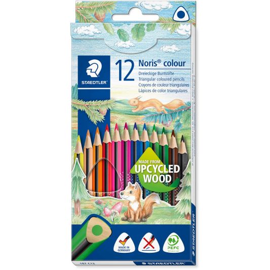 Noris® colour 187 farveblyanter i et trekantet design. Farveblyanter med trekantet greb for afslappet og behagelig skrivning og tegning – Fremstillet af Upcycled træ. Fløjlsblød, non-slip overflade og høj brudstyrke. Attraktivt “stripe and stars” design. Træindhold fra certificerede, bæredygtigt forvaltede skove. Æske fremstillet af 80% genbrugsmateriale, som kan genbruges igen.